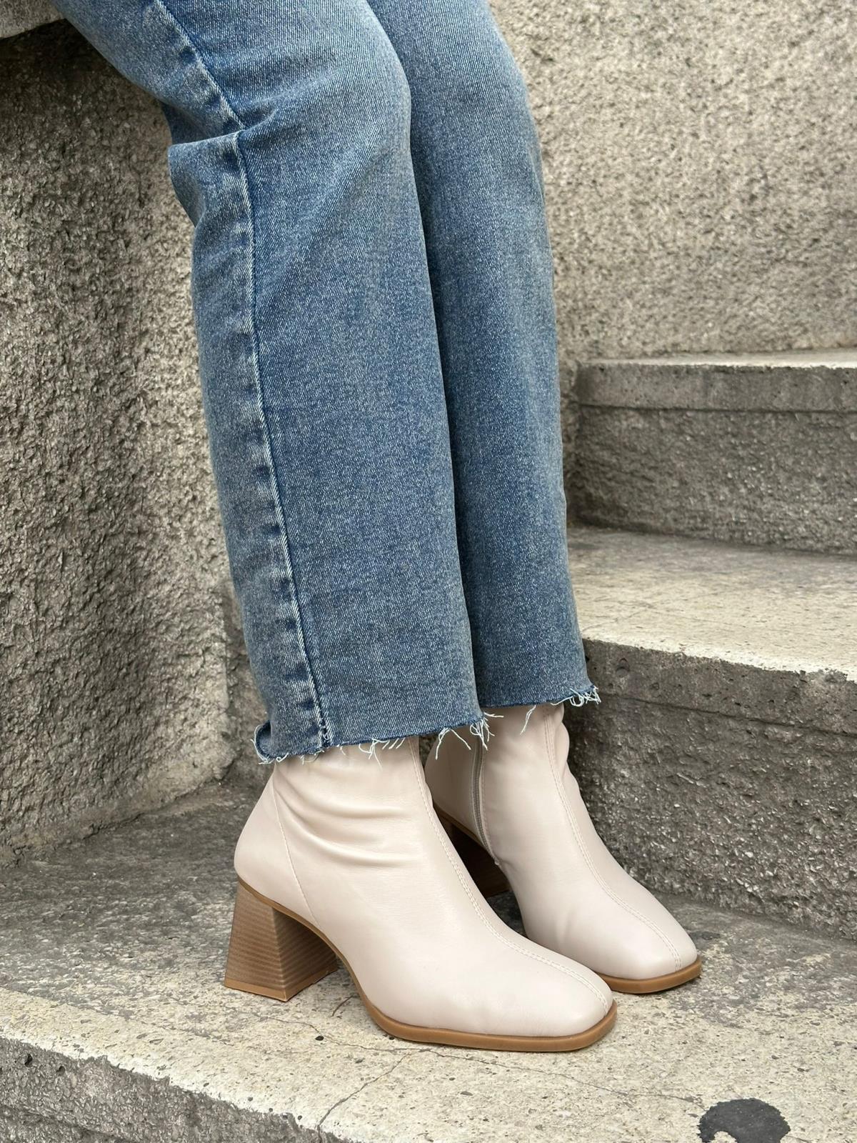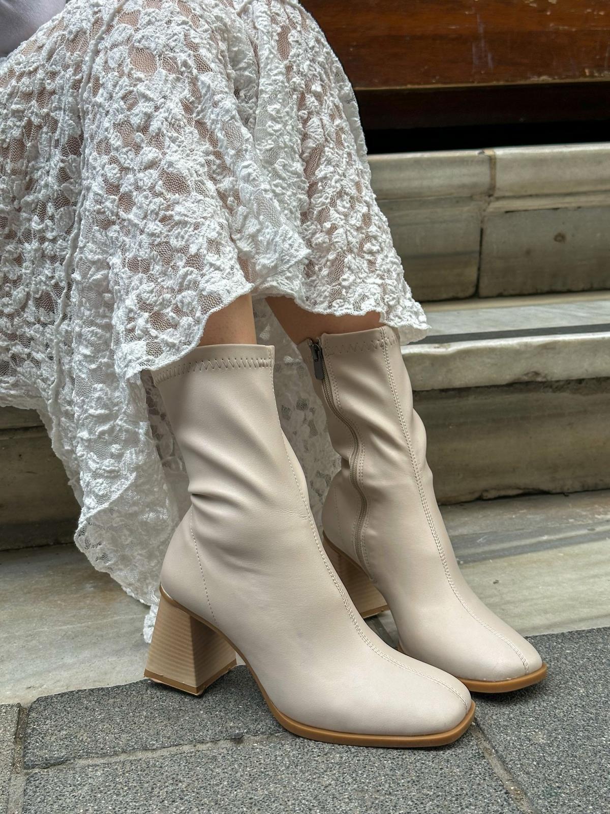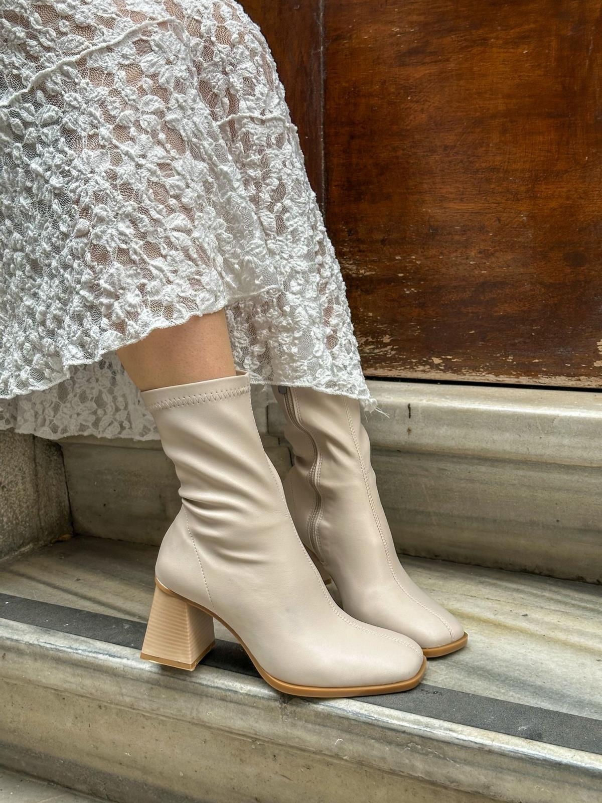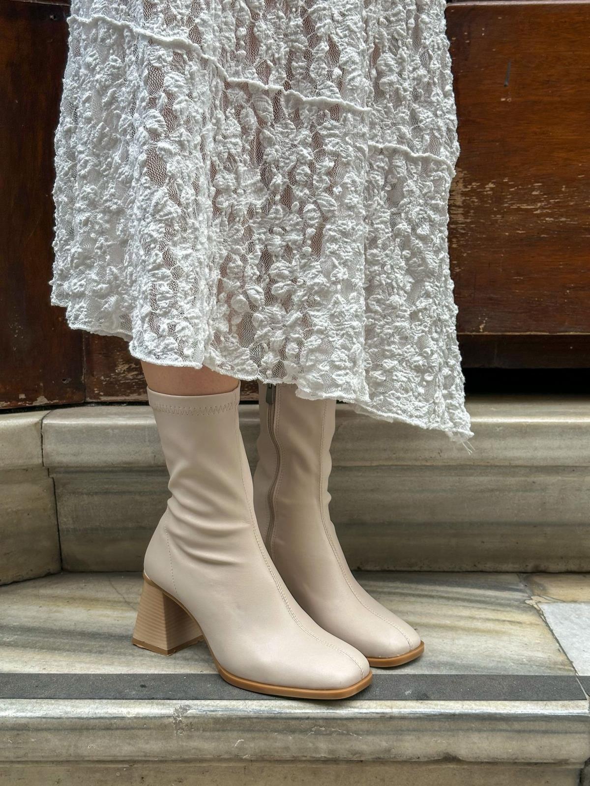 Bej Cilt Streç (Memmy) Küt Burun Kadın Topuklu Bot