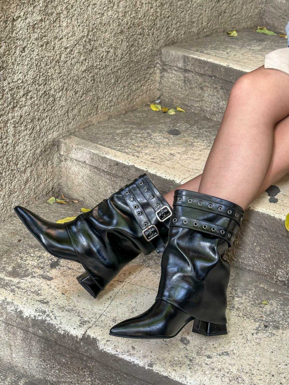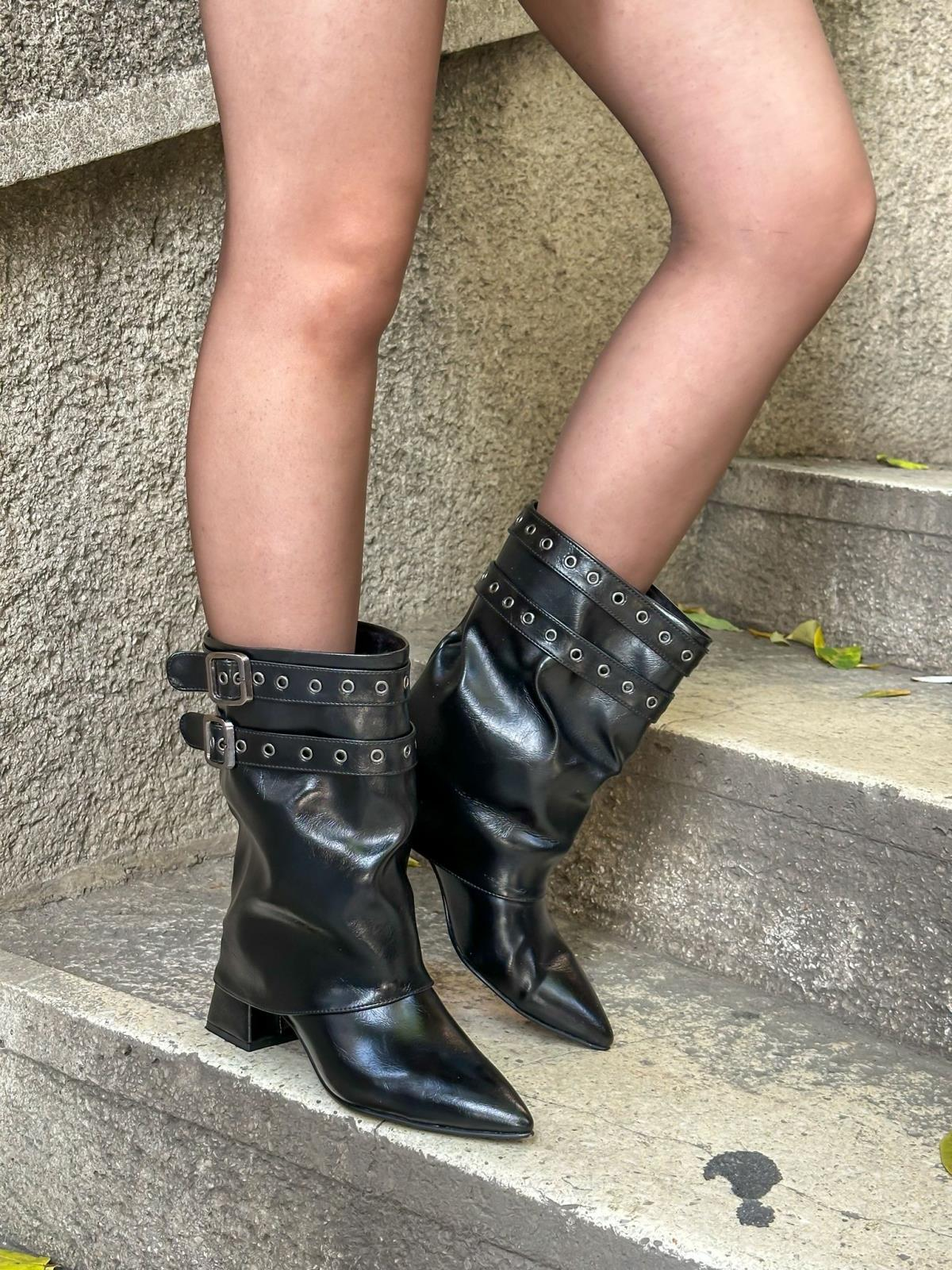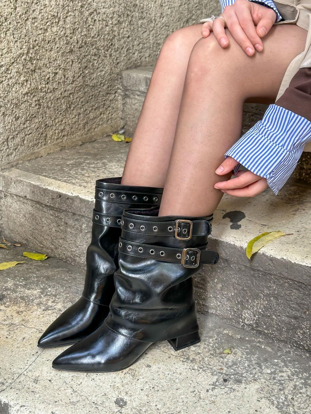 Siyah Kırışık Deri (Booby) Kemer Detay Topuklu Kadın Çizme