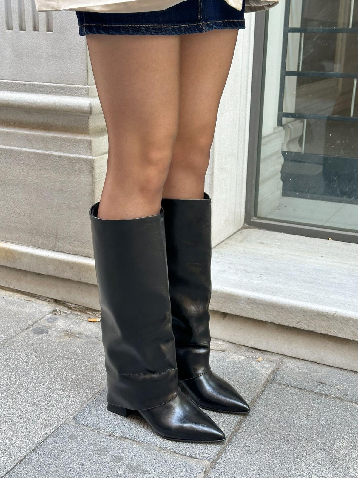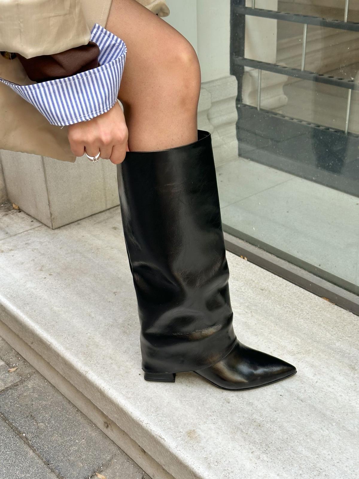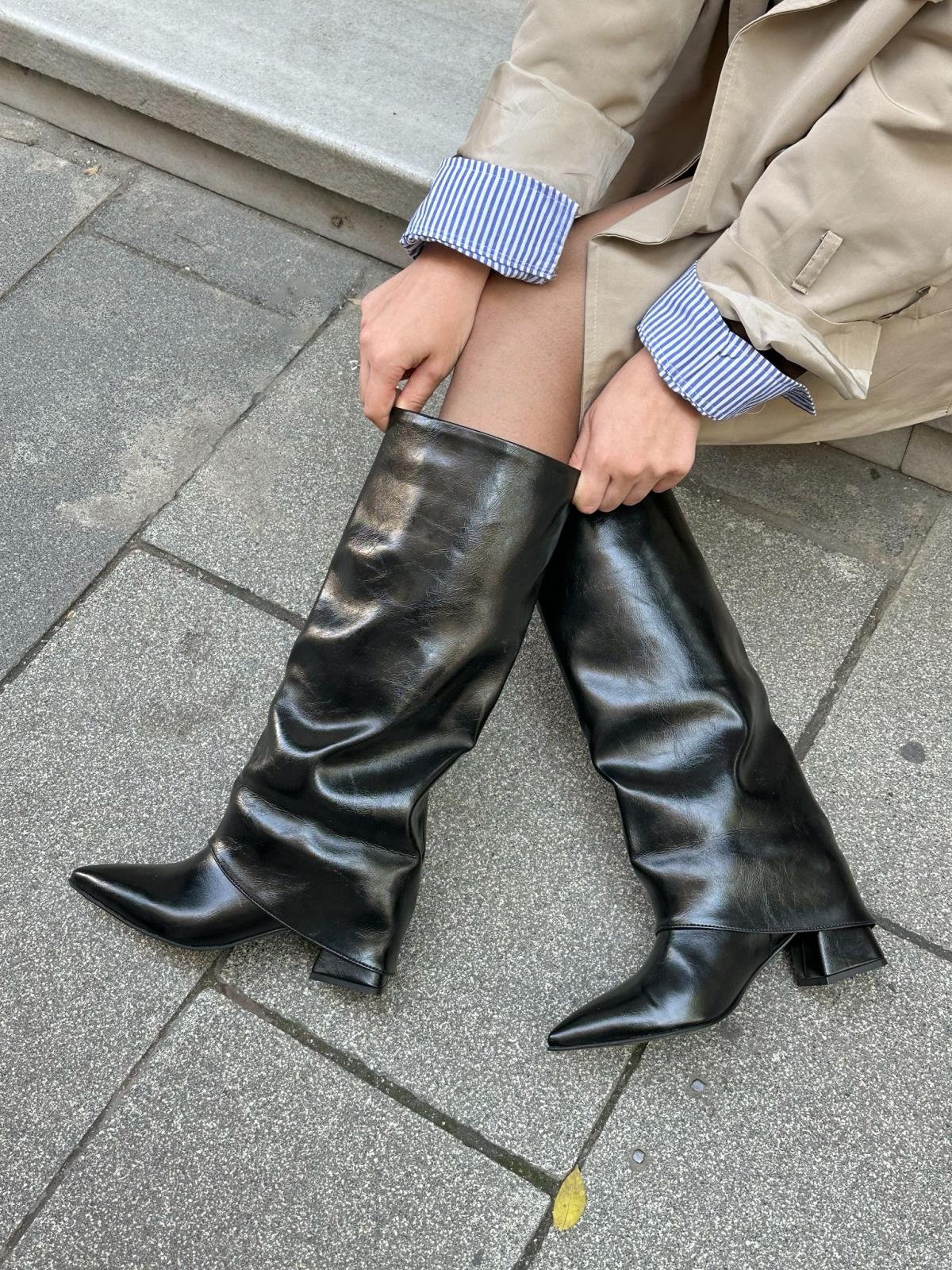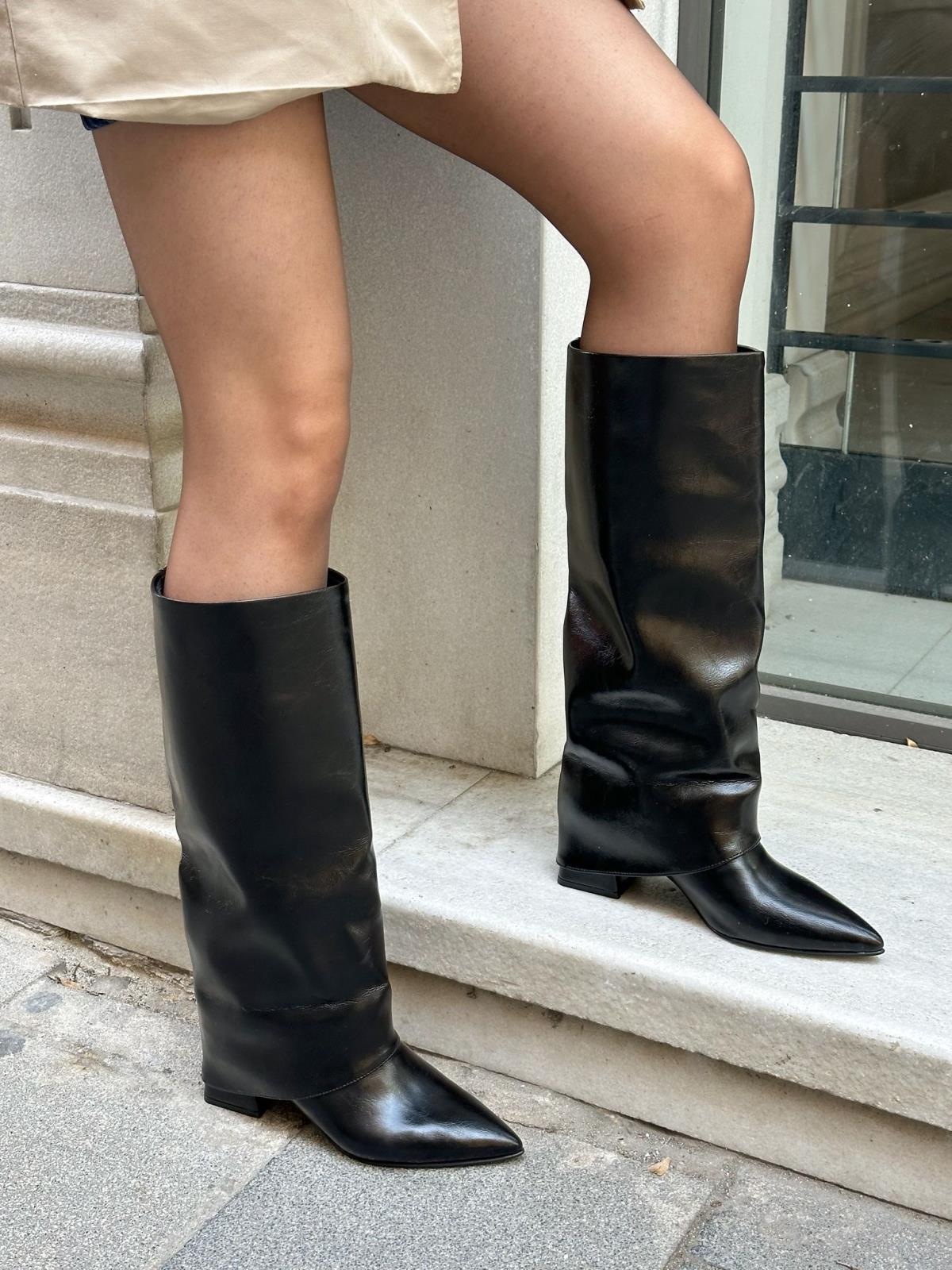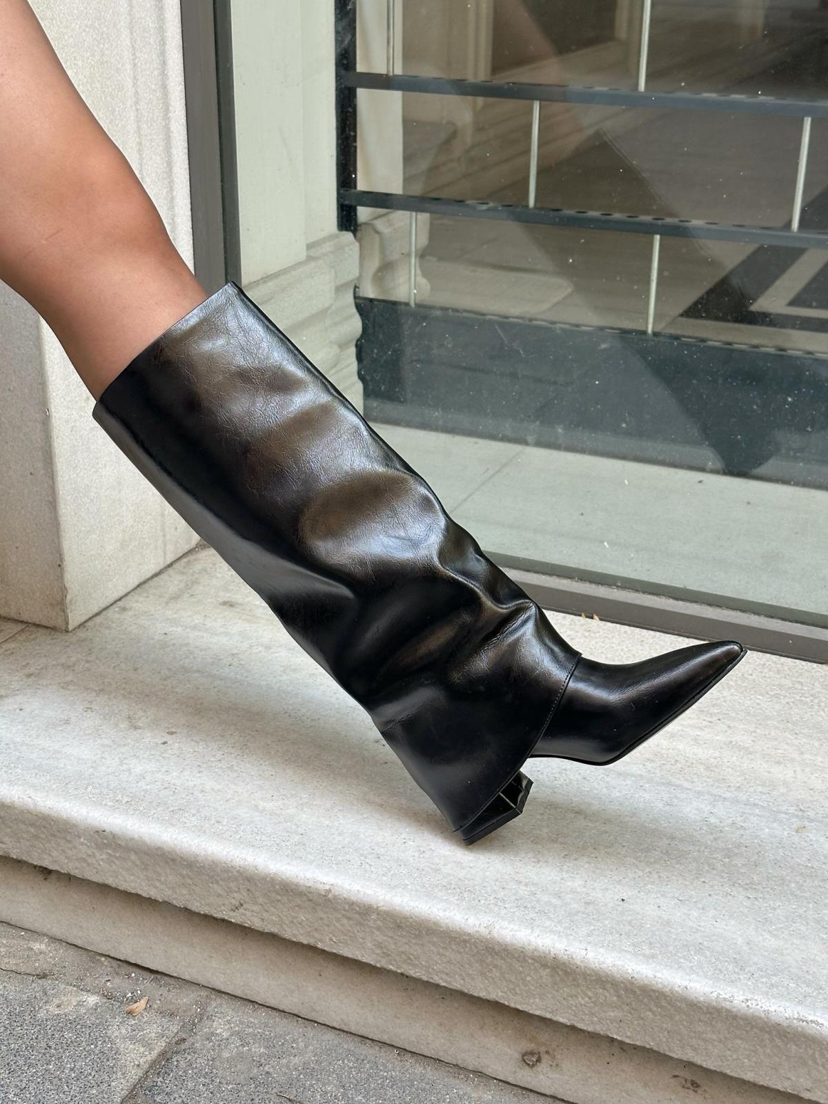 Siyah Kırışık Deri (Favy) Topuklu Kadın Çizme